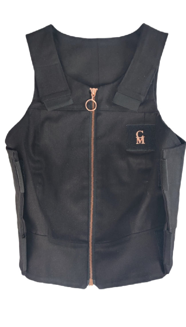 - Black Denim structured vest with rose gold zips and Velcro shoulder and side fasteners